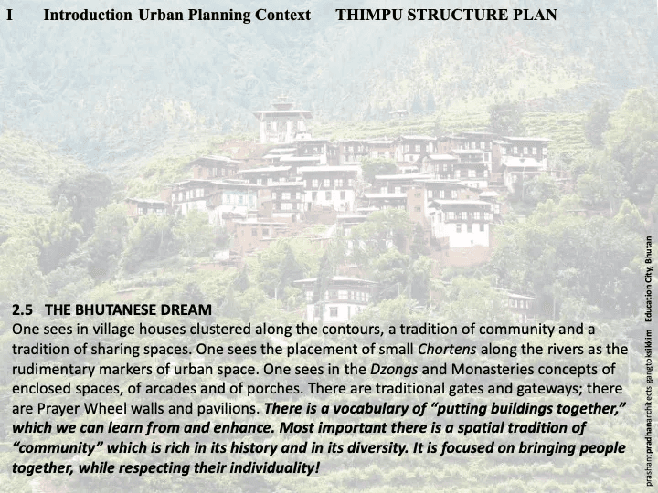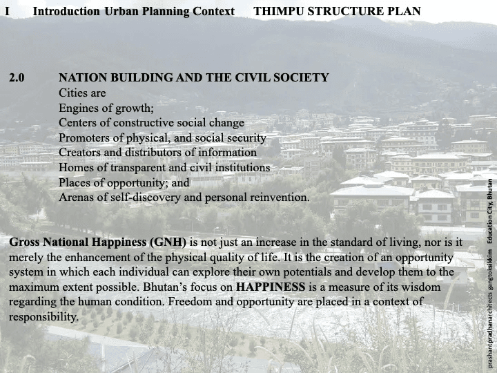The proposal rooted in the context – physically and culturally found that GNH (Gross National Happiness) – a marker of social and economic progress, a pertinent starting point.