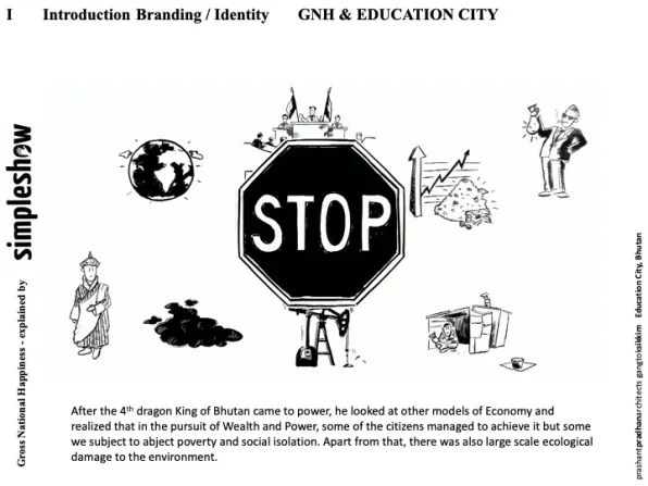 Excerpts from the video by Simpleshow :After the 4th Dragon King of Bhutan came to power, he looked at other models of Economy and realized that in the pursuit of Wealth and Power, some of the citizens managed to achieve it but some we subject to abject poverty and social isolation. Apart from that, there was also large scale ecological damage to the environment.