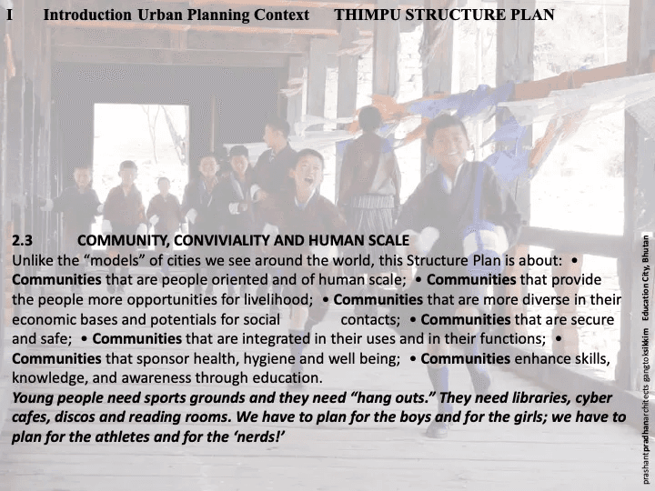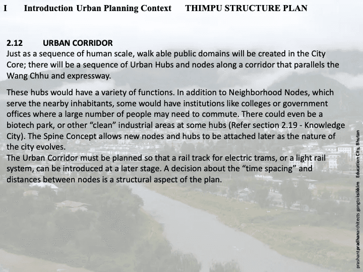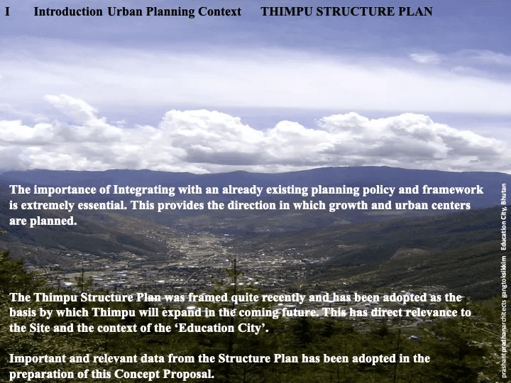 The importance of Integrating with an already existing planning policy and framework is extremely essential. This provides the direction in which growth and urban centers are planned. The Thimpu Structure Plan was framed quite recently and has been adopted as the basis by which Thimpu will expand in the coming future. This has direct relevance to the Site and the context of the ‘Education City’.